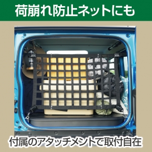 | ●車内の荷物の収納や荷崩れ防止に最適なネットです。 ●しっかりとしたベルト素材のネットなので荷物の重さで伸びにくいです。 ●付属の様々なアタッチメントを使用すると、荷崩れや横滑りを防止するカーゴネットとして取付け可能です。 ●ネットもステッチも黒色だから、ブラックアウトされた無骨なラゲッジ空間を演出します。 ●アイボルト/カラビナ/Dカンが付属して、組み合わせ次第で様々な取付けができます。 < 別売のサイドバーにお取付けいただく場合 > ●ラゲッジエリアの天井デッドスペースを有効活用し、軽い荷物の収納に最適です。 ●収納が簡単に増設できるので、車中泊やアウトドア・キャンプに重宝します。 ●垂れ下がりにくいので、車中泊時には車内の圧迫感を軽減します。また、走行中の後方視界も塞ぎにくいので安心です。 ●荷室に積んだ荷物と分けられるので、使用頻度の高い上着や帽子などの出し入れがスムーズになり便利です。 ●伸びにくいベルト製ネットは走行中でもバウンドしにくいので安心です。 ●別売のサイドバー(EE-231)に取り付ければ、収納力がさらにアップし、車中泊がもっと快適になります。 ●掲載の製品は、スズキ Jimny(JB64W系)・Jimny SIERRA(JB74W系)・Jimny NOMADE(JC74W系)専用です。 ※ノマドのラゲッジ入口の下部にサービスホール(ネジ穴)が装備されていないため、荷崩れ防止用の付属部品であるアイボルトが取付けできません。 ※一部の車種には、取付けできない場合があります。詳しくは、下記の適合表をご確認ください。 <適合表のリンク> ※本製品は、調査日2025年8月現在の車種に適合します。 調査日以降にマイナーチェンジした車には使用できない場合があります。 ●掲載の製品の適合型式 : Jimny(JB64W系) 【1型~4型】、 Jimny SIERRA(JB74W系)【 1型~4型】、Jimny NOMADE(JC74W系)【 1型 】 ※詳しくは、下記の型式表をご確認ください。 <型式表のリンク> ※本製品は、調査日2025年7月現在の車種に適合します。 調査日以降にマイナーチェンジした車には使用できない場合があります。 |
