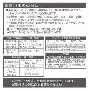 | ●ダッシュボード(メーターパネル上)に両面テープで設置する充電・収納トレイです。 ●充電トレイは、スマ-トフォンを見やすい角度に無段階で自由に調節できます。(水平*~85°まで) (*約0~15°までは固定できません。) ●周囲には鍵や小物のチョイ置きできて、便利なコイン・チケットホルダーも備えています。 ●最大出力15Wのワイヤレス充電に対応しています。 ●トレイにUSB-Aポートを搭載しており、有線*でもスマ-トフォンを充電可能です。(*コードは付属していません。) ●スマ-トフォンの飛び出しを防止する、落下防止ステーを付属しています。(落下防止ステーは格納可能) ワイヤレス充電の対応表(一部の機種でワイヤレス充電ができない場合があります) ●掲載の製品は、スズキ Jimny(JB64W系)・Jimny SIERRA(JB74W系)・Jimny NOMADE(JC74W系)専用です。 ※一部の車種には、取付けできない場合があります。詳しくは、下記の適合表をご確認ください。 <適合表のリンク> ※本製品は、調査日2025年8月現在の車種に適合します。 調査日以降にマイナーチェンジした車には使用できない場合があります。 ●掲載の製品の適合型式 : Jimny(JB64W系) 【1型~4型】、 Jimny SIERRA(JB74W系)【 1型~4型】、Jimny NOMADE(JC74W系)【 1型 】 ※詳しくは、下記の型式表をご確認ください。 <型式表のリンク> ※本製品は、調査日2025年7月現在の車種に適合します。 調査日以降にマイナーチェンジした車には使用できない場合があります。 |