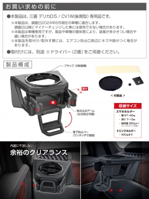 | ・ドリンクとスマホを同時に置ける デリカ D:5 専用のドリンクホルダーです。(助手席用1個入り) ・コンビニコーヒー、細缶・太缶、ペットボトル(500/600ml)などの様々なドリンクを収納できます。 ・スムーズなドリンクの出し入れができるフラップと、カタカタ音を防ぐコースターを装備しています。(ともにソフトなシリコン製) ・スマホホルダーは、ドリンクの出し入れを妨げないローポジション設計です。 ・スマホが接触する部分は全てソフトなラバー加工をしています。 ・スマホの落下防止バーはワンタッチで開閉できる回転格納式です。 ・別売のカラーリングに付け替えると、自分好みにドレスアップできます。 ・両面テープと金具のガッチリ取付け。 ・本製品は、三菱 デリカD:5(CV1W後期型)専用品です。 |