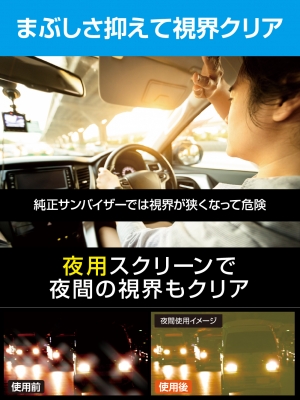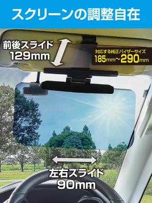 | ・昼は眩しい陽射しをカットし、夜は眩しいライト光をカットします。 ・夜用スクリーンにより、夜間の視界もクリア。自動車が多い街中に最適です。 ・純正バイザーの奥行き185 ~ 290mm 以内・厚み21mm以内まで取付け可能です。 ※スクリーンサイズ 350mm×180mm ・純正サンバイザーに簡単に取付けできます。 ・前後に129mm・左右に90mmのスライドが可能です。 ・アームで挟むだけの簡単取付けなので、純正サンバイザーに取付け跡が残りにくいです。 ・UVカット素材で有害な紫外線から目を保護します。 ・本製品を取付けたまま純正バイザーミラーが使用できます。 ・スクリーンは、任意の角度で保持できるトルクヒンジ仕様です。 |