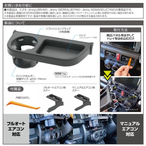 | ●モニター下にドリンクと小物の収納スペースをつくる増設トレイです。 ●φ53~74mmの飲み物が入るドリンクホルダーと、小物が飛び出さない全周フチ付きトレイを備えています。 ●運転席からでも助手席からでも手が届くため、運転者も同乗者も使いやすく便利です。 ●スマートキー、加熱式タバコ、充電ケーブル、駐車券などの小物のちょい置きに最適です。 ●コンビニコーヒー、細缶・太缶、ペットボトル(~650ml)などの様々なドリンクを収納でき、エアコンの冷風・温風により、ドリンクを保冷・保温する効果があります。 ●ソフトシリコンフラップでドリンクの出し入れがスムーズで簡単です。 ●トレイとドリンクホルダーの内底は、カタカタ音を低減するクッションシート付きです。 ●純正と同等の取付けクリップを採用し、純正パネルと付け替えるだけの簡単取付けです。(所要時間の目安:5分) ●フルオートエアコンとマニュアルエアコンの両タイプに取付けできるように、2種類のステーを付属しています。 ●純正パネルを取外す工具「内張りはがし」を付属しています。 ●掲載の製品は、スズキ Jimny(JB64W系)・Jimny SIERRA(JB74W系)・Jimny NOMADE(JC74W系)専用です。 ※一部の車種には、取付けできない場合があります。詳しくは、下記の適合表をご確認ください。 <適合表のリンク> ※本製品は、調査日2025年8月現在の車種に適合します。 調査日以降にマイナーチェンジした車には使用できない場合があります。 ●掲載の製品の適合型式 : Jimny(JB64W系) 【1型~4型】、 Jimny SIERRA(JB74W系)【 1型~4型】、Jimny NOMADE(JC74W系)【 1型 】 ※詳しくは、下記の型式表をご確認ください。 <型式表のリンク> ※本製品は、調査日2025年7月現在の車種に適合します。 調査日以降にマイナーチェンジした車には使用できない場合があります。 |