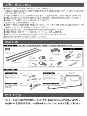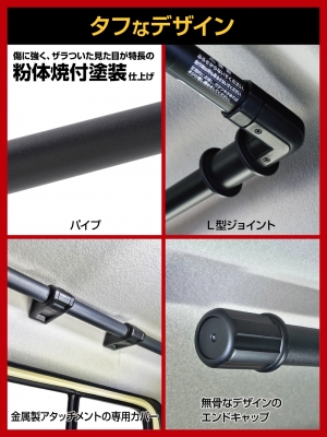 | ・Jimny NOMADE(JC74W系)専用の、3本のパイプを連結する総全長約3mの増設サイドバーです。 ・ラゲッジスペースの天井空間を有効活用し、収納力をアップするコの字型形状です。 ・左右のパイプはEE-231よりも約40cmも長く、さらにラゲッジ入口側のパイプを連結することで頑丈さと収納力を向上します。 ・傷に強く、ザラついた見た目が特長の粉体塗装仕上げのブラックバーが、室内を無骨に演出します。 ・アシストグリップのネジ穴を利用し、加工無しで取付けが可能です。 ・ルーフネットやハンガーなどがズレ落ちない構造のL型ジョイントを採用しています。 ・本製品は難燃性プラスチック(V-0)を使用しています。 ●掲載の製品は、スズキ Jimny NOMADE(JC74W系)専用です。 ※ Jimny(JB64W系)・Jimny SIERRA(JB74W系)には、取付けできません。詳しくは、下記の適合表をご確認ください。 <車種別適合表のリンク> ●掲載の製品の適合型式 については、下記の型式表をご確認ください。 <型式表のリンク> |
