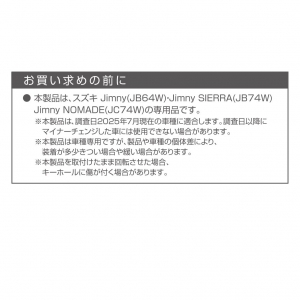| ●Jimny・Jimny SIERRAの、キーホールに取付けるだけで、クロームメッキの純正キーホールをタフネスデザインにドレスアップするカバーです。 ●キーホールの泥詰まりを防ぎ、汚れにくくなります。 ●キーを差し込む時でもかんたんに着脱できるマグネット取付け。 ●リクエストスイッチとキーホールを黒色で統一感を出すことで、ドアノブ周りの印象が引き締まります。 ●運転席側・助手席側 兼用です。 ●計2個入り ●掲載の製品は、スズキ Jimny(JB64W系)・Jimny SIERRA(JB74W系)・Jimny NOMADE(JC74W系)専用です。 ※一部の車種には、取付けできない場合があります。詳しくは、下記の適合表をご確認ください。 <適合表のリンク> ※本製品は、調査日2025年8月現在の車種に適合します。 調査日以降にマイナーチェンジした車には使用できない場合があります。 ●掲載の製品の適合型式 : Jimny(JB64W系) 【1型~4型】、 Jimny SIERRA(JB74W系)【 1型~4型】、Jimny NOMADE(JC74W系)【 1型 】 ※詳しくは、下記の型式表をご確認ください。 <型式表のリンク> ※本製品は、調査日2025年7月現在の車種に適合します。 調査日以降にマイナーチェンジした車には使用できない場合があります。 |
