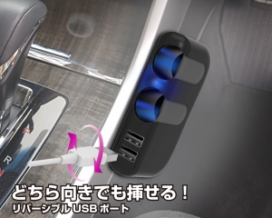 | 12V2連ソケットと5V/2.4A合計2ポートUSBを搭載 カープラグの抜け防止・厚み最薄(約23mm)デザインのコードタイプ USBは自動判別・リバーシブルUSBポート搭載 リバーシブルタイプのUSB ポートの注意点はコチラ |
