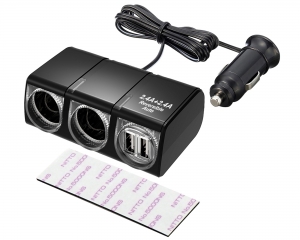 | 接続USB機器を自動判別し最適充電できるリバーシブルUSB2ポート(5V/2.4A×2合計4.8A)と12V2連ソケットを搭載したコードタイプソケット 接続USB機器を自動判別し、それぞれに最適な電流で充電できる お好きな場所に両面テープで貼付けられるコードタイプ(コード長:1m) |