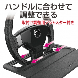 | ●運転席で飲食やパソコン・タブレット等の使用ができます。 ●コンパクトに折りたためるので車内の収納に困りません。 ●折りたたんだ状態でもミニテーブルとして使用することができます。 ●ミニテーブルの時にはスマホ・タブレットを立てかけられる溝がついてます。 ●外径35~40cmの純正ハンドルに取付けることができます。 ●取付け調整用のアジャスターを4個付属しています。 ●専用の収納ポーチが付属しています。 ●耐荷重量:3kg 折りたたみテーブルが取付けられない場合 折りたたみテーブル 開け方のコツ |