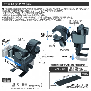 | ・アシストグリップ取付けで視界を妨げにくいスマホホルダーです。 ・ネジ式クリップのため、アシストグリップにしっかりと取付けできます。 ・目の高さに設置したスマホは視線移動が少なく、画面を確認しやすいのでカ-ナビに最適です。 ・間接アームが無い構造で振動に強いため、揺れにくく、操作がしやすいです。 ・アシストグリップを備えた軽バンやワゴン、トラックなどの商用車に最適です。 ・ホルダー部は、スマホで押し当てるだけのワンタッチホールド機構を搭載しています。 ・背面のボールジョイントにより、ホルダーの向きが調整できます。 ・アシストグリップのキズ防止に有効な滑り止めシートが付属しています。 Amazonでご購入はこちら |
