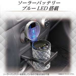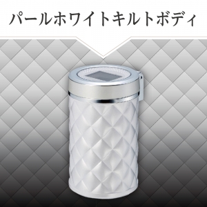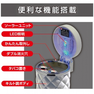 | ●インテリアをラグジュアリーに演出するキルトデザインの灰皿です。 ●夜間などの暗い場所で便利なブルーLED照明付き。 ●電源はソーラーバッテリーを使用していますので電池交換が不要です。 ●フタ部とボトルは外せるので、吸い殻が簡単に捨てられます。 |