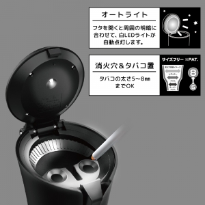 | ●「全開灰すて」機能でフタが90度、消火部が180度に開く灰皿です。 ※誤作動防止のロック機能が付いています。 ●溜まった吸い殻が引っかからず捨てることが出来ます。 ●スーパースリム~レギュラーサイズのタバコ対応の消火穴とタバコ置を備えています。 ●ソーラー+オートライト(白LED)で周囲の明暗に合わせて自動点灯します。 ●色はマットブラック |