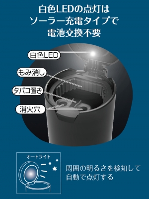 | ●「全開灰捨て」機能で簡単に吸い殻を捨てることができる灰皿です。 ●スーパースリムの太さまで対応の消火穴とタバコ置きを装備しています。 ●白色LEDの点灯はソーラー充電タイプで電池交換が不要です。 ※周囲の明るさを検知して自動で点灯するオートライト機能付き。 |