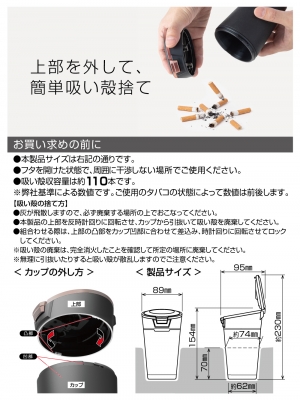 | ・車内での使いやすさにこだわったソーラーライト付き多機能灰皿です。 ・「灰づまり自動クリーニング消火穴」をはじめ、車載用灰皿に特化した13の機能を備えています。 ・振動音を抑えるラバー製カップで、走行中でも快適な車内空間を保ちます。 ・本革調リング&ブラックメッキ・カッパーメタリックをあしらったデザインです。 |