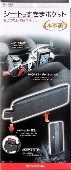 | ●シートサイドとコンソールの隙間に取付ける便利なポケットです。 ●表面に高級感がある本革調素材を採用しています。 ●フチにワイヤーが入っているので隙間やシートの形に合わせることができます。 ●落下防止ボードで本製品が隙間に落ち込むのを防止できます。 ●2 個のスペーサーで自由にポケット内をレイアウトすることができます。 ●伸縮バンドをシートベルトバックルに引っ掛けることでポケットの前後のズレを防止できます。 |