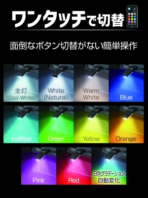 | ・8色の単色点灯や点滅パターンをリモコンで操作できるUSB-Aポート用のLEDライトです。 ・コンソールBOXやセンターコンソールなどの暗い場所を照らすのに最適です。 ・LEDを3つ搭載したライト部分は180°首振り機構なので、様々な方向を照らせます。 ・リモコン操作により、離れた場所からでも点灯モードを直接選べるので便利です。 ・従来品のような極小ボタンの操作から解放され、快適にライトアップが楽しめます。 ・ホワイトLEDを2個装備しているので、濁りのないナチュラルな白色が発光できます。 ・明るさの調整やスローフラッシュモード*(蛍のような光り方)への切替ができます。*側面参照 ・エンジンやモーターを切って再始動しても前回の設定をメモリーしています。 ・別売の本体(増設用USBライト)を複数個増設しても、点灯色の変更がリモコンで簡単です。 ライト類の取付け位置についてのご注意 Amazonでご購入はこちら E125 増設ライト:Amazonはこちら E127 増設リモコン:Amazonはこちら |