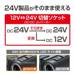 | ●トラックなどの24V電源出力の車専用 ●24V出力を12V出力へと変換するDC/DCコンバーター ●12Vを出力するソケットは3口あります ・そのうち1口は12Vと24Vに出力電圧を切り替えることができるので24V電源の機器も併せて使用できます ・24V出力時は、誤って12V用品を使用しないようにアンバー色のLEDが点灯します ●USBの出力は2ポートあります ・そのうち1口はUSB Type-Cポートです ・USB PDに対応しているので、対応のスマホ※を最大出力18Wで高速に充電することができます ・残り1口はUSB Type-Aポートです ・最大出力5V/2.4Aで表裏を気にしないで挿せるリバーシブルタイプです ・接続機器を自動で判別して最適充電を行う機能を搭載しています ・2ポートとも、一目で充電状態が分かるインジケーターを搭載しています ●お好きな場所に両面テープで貼り付けられる約1mのコード付きです ※お手持ちの機器のUSB PD対応に関してはキャリア・メーカー・説明書でご確認ください |