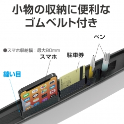 ●伸縮バンドをシートベルトバックルに引っ掛けることでポケットの前後のズレを防止できます。
