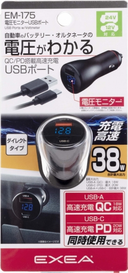 | オープンプライス ■製品サイズ: H30xW30xD71 ■パッケージ: H180xW85xD70 60 g ■⼩箱サイズ: H200xW305xD245 20個⼊ ■外箱サイズ: H425xW500xD330 80個⼊ ■定格:電源電圧/DC12,24V 最大許容電力38W USB-A単独QC:最大18W 出力電圧DC5V~DC12V(可変)/出力電流最大3A(可変) USB-C単独PD:最大20W DC5V/3A,DC9V/2.22A,DC12V/1.67A USB-A+USB-C:最大38W (2ポート使用時、QC/PD対応) ■JAN:4974267051753 Amazonでご購入はこちら |