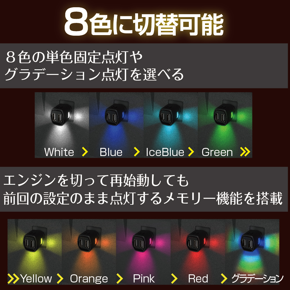 | ●8色の単色固定点灯やグラデーション点灯を選べるライト機能付きのUSBポートです。 ●3つのLEDにより、お車のソケット周辺への照射方向を選択できます。 ●明るさの調整やホタルモード*(蛍のような光り方)への切替ができます。*下記参照 ●エンジンを切って再始動しても前回の設定のまま点灯するメモリー機能を搭載してます。 ●USBポートは接続した機種を自動で判別し、機種に合った電流で最適充電を行います。 ●リバーシブルUSBポート採用で、接続するUSBの表裏を気にせずに挿せます。 ●USB出力は各ポート5V/2.4Aで、2ポート合計4.8Aです。 ●12V/24V対応です。 |