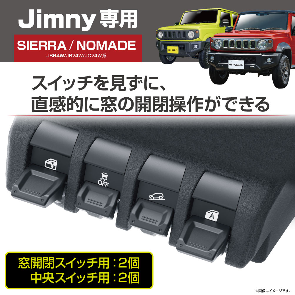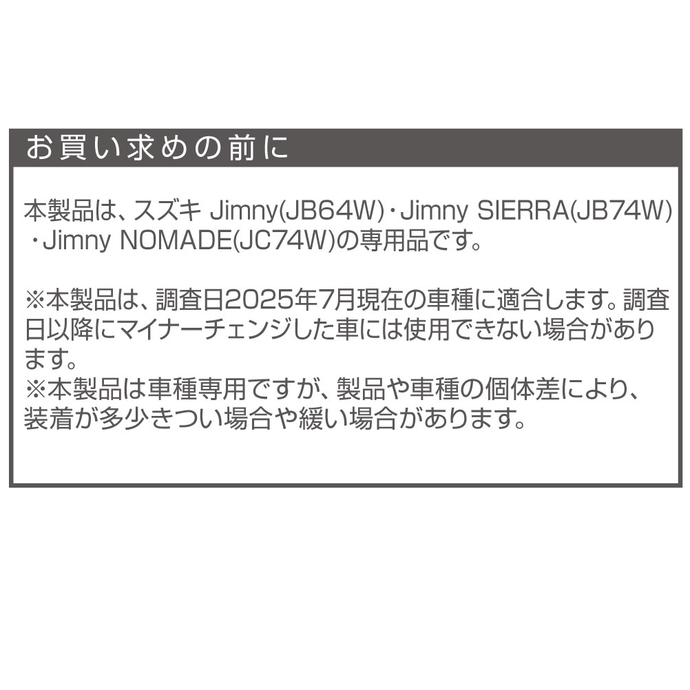 | ●窓の開閉スイッチの操作性を向上させるスイッチ延長パーツとカバーのセットです。 ●延長パーツを取付けると、走行中でもスイッチを見ずに、直感的な窓の開閉操作ができて便利です。 ●黒のタフネスデザインでブラックアウト化し、スイッチ周りの無骨さを際立たせます。 ●スイッチは4個1セットです。 ①窓開閉スイッチ用の延長パーツ×2個 ②中央スイッチ用のカバー×2個 ●両面テープで貼付けるだけの簡単取付けです。 2022年日刊自動車新聞 アイディア部門賞 受賞 ●掲載の製品は、スズキ Jimny(JB64W系)・Jimny SIERRA(JB74W系)・Jimny NOMADE(JC74W系)専用です。 ※一部の車種には、取付けできない場合があります。詳しくは、下記の適合表をご確認ください。 <適合表のリンク> ※本製品は、調査日2025年8月現在の車種に適合します。 調査日以降にマイナーチェンジした車には使用できない場合があります。 ●掲載の製品の適合型式 : Jimny(JB64W系) 【1型~4型】、 Jimny SIERRA(JB74W系)【 1型~4型】、Jimny NOMADE(JC74W系)【 1型 】 ※詳しくは、下記の型式表をご確認ください。 <型式表のリンク> ※本製品は、調査日2025年7月現在の車種に適合します。 調査日以降にマイナーチェンジした車には使用できない場合があります。 |