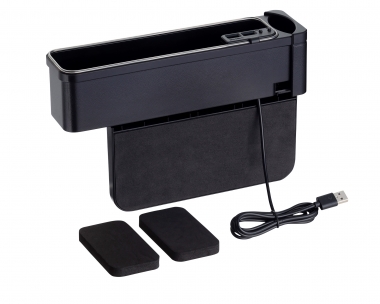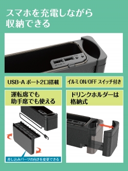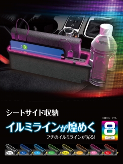 | ●ドリンク・長財布・スマホが同時に置ける小物の収納に便利な増設トレイです。 ●8色の単色固定点灯やグラデーション点灯を選択できるイルミネーションラインを搭載し、車内をムーディに演出します。 ●暗い車内でもドリンクの出し入れが簡単にできるドリンク用間接照明を装備しています。 ●ドリンクホルダーは格納式なので、使わない時はコンパクトになります。 ●エンジンを切って再始動しても前回の設定のまま点灯するメモリー機能を搭載しています。 ●シートサイドに差し込むだけの簡単取付けです。ベンチシートにも設置可能です。 ●差し込みパーツを付け替えて向きを変えると、運転席・助手席のどちらでも使用できます。 ●リバーシブルUSB-Aポートを2口搭載しているので、スマホを充電しながら収納できます。 ●車内に馴染む本革調テクスチャを採用しています。 |
