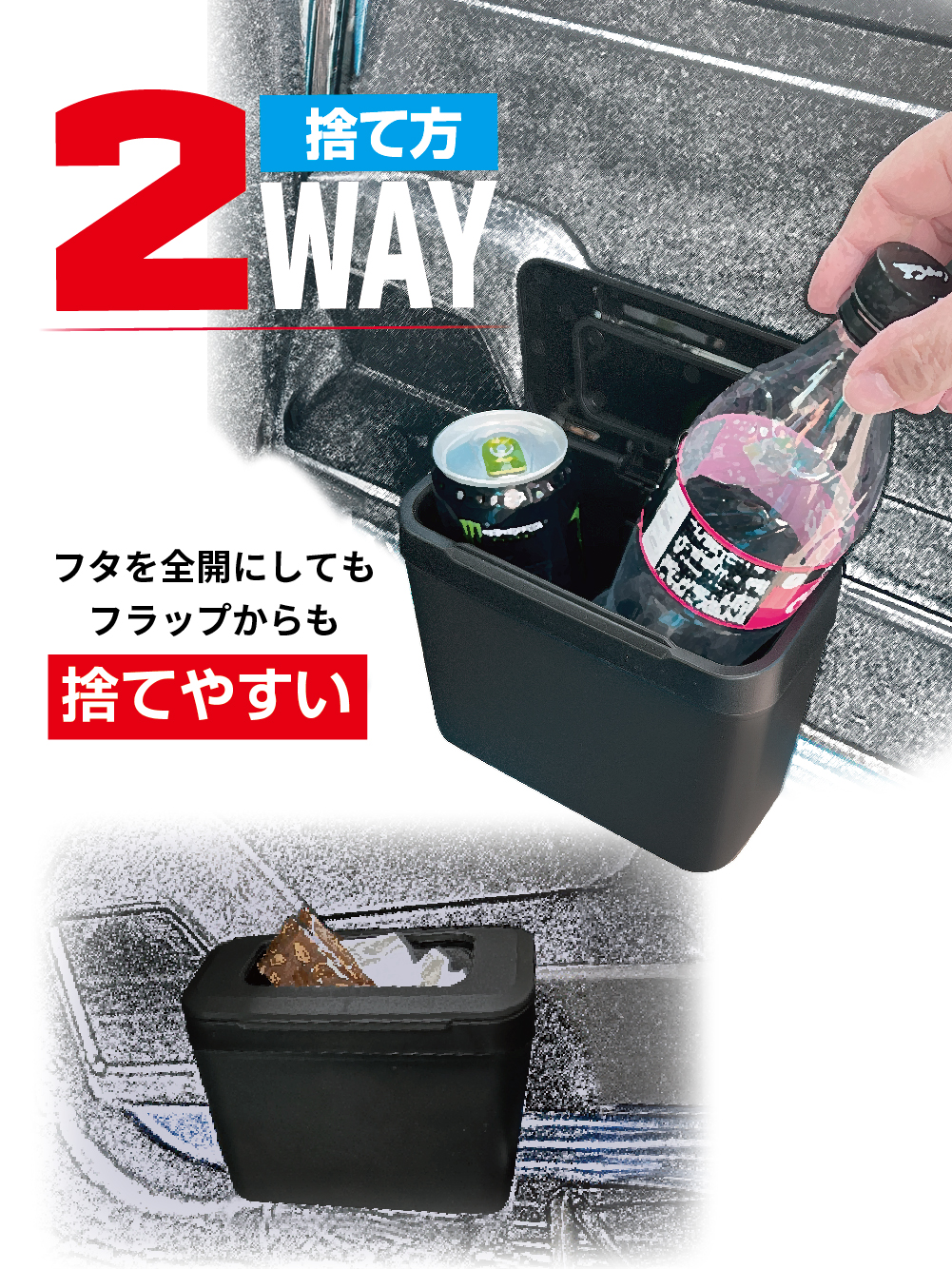 | ●フタを閉めたままで簡単にゴミが捨てられるフラップを組合せ、状況に応じて開け方が選べる便利な「ダブルリッド」構造のゴミ箱です。 ●使いやすいセンターコンソールに取付けられて、本体の着脱もできるベース付きです。 (曲面対応、大型貼付けベース) ●フタを開けたまま固定もできるので、大きなゴミも入れやすく、廃棄時のゴミ出しもスムーズです。 ●フタの開閉向きを変えられるので、取付け場所や使い勝手に合わせて取付けられます。 ●邪魔になりにくいサイズと、すっきりデザインでコンソール周りに最適なゴミ箱です。 ●フタの際まで入るのでたっぷり使えます。 |