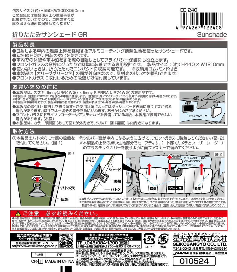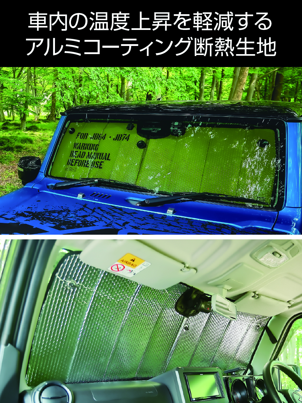 | ●日射による車内の温度上昇を軽減するアルミコーティング断熱生地を使ったサンシェードです。 ●紫外線を防ぎ、内装の劣化を防ぎます。 ●車内での休憩や車中泊をする際の目隠しとしてプライバシー保護にも役立ちます。 ●フロントガラスの窓枠にぴったりで簡単に装着できる専用設計です。 製品サイズ:(約)H440×W1210mm ●使わないときは、折りたたんでコンパクトに収納可能です。 ※収納用ゴムバンド付き ●本製品は【オリーブグリーン色】の面が外向きなので、反射光の眩しさを緩和できます。 ●フロントガラスに取付けるための吸盤が3個付属しています。 ●掲載の製品は、スズキ Jimny(JB64W系)・Jimny SIERRA(JB74W系)・Jimny NOMADE(JC74W系)専用です。 ※ノマドでは、ルームミラー裏のセーフティサポート部(センサーまたはカメラ)のプラスチックカバーとやや干渉します。 ※一部の車種には、取付けできない場合があります。詳しくは、下記の適合表をご確認ください。 <適合表のリンク> ※本製品は、調査日2025年8月現在の車種に適合します。 調査日以降にマイナーチェンジした車には使用できない場合があります。 ●掲載の製品の適合型式 : Jimny(JB64W系) 【1型~4型】、 Jimny SIERRA(JB74W系)【 1型~4型】、Jimny NOMADE(JC74W系)【 1型 】 ※詳しくは、下記の型式表をご確認ください。 <型式表のリンク> ※本製品は、調査日2025年7月現在の車種に適合します。 調査日以降にマイナーチェンジした車には使用できない場合があります。 |
