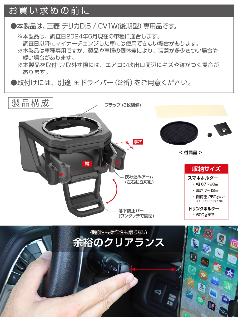 | ・ドリンクとスマホを同時に置ける デリカ D:5 専用のドリンクホルダーです。(運転席用1個入り) ・コンビニコーヒー、細缶・太缶、ペットボトル(500/600ml)などの様々なドリンクを収納できます。 ・スムーズなドリンクの出し入れができるフラップと、カタカタ音を防ぐコースターを装備しています。(ともにソフトなシリコン製) ・スマホホルダーは、ドリンクの出し入れを妨げないローポジション設計です。 ・スマホが接触する部分は全てソフトなラバー加工をしています。 ・スマホの落下防止バーはワンタッチで開閉できる回転格納式です。 ・別売のカラーリングに付け替えると、自分好みにドレスアップできます。 ・両面テープと金具のガッチリ取付け。 ・本製品は、三菱 デリカD:5(CV1W後期型)専用品です。 |