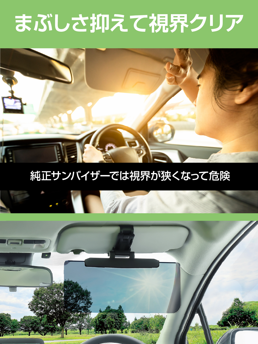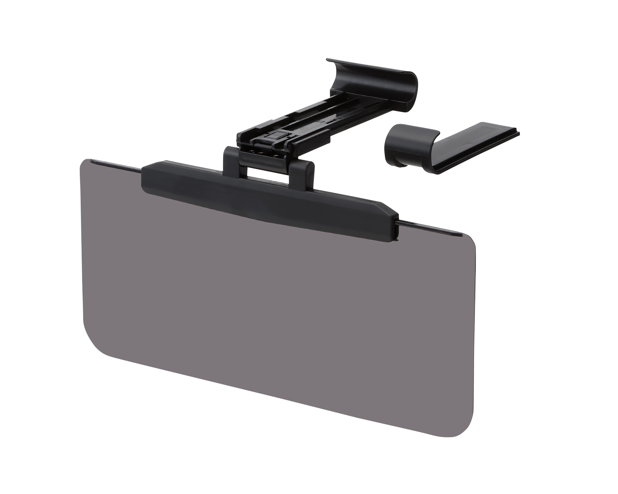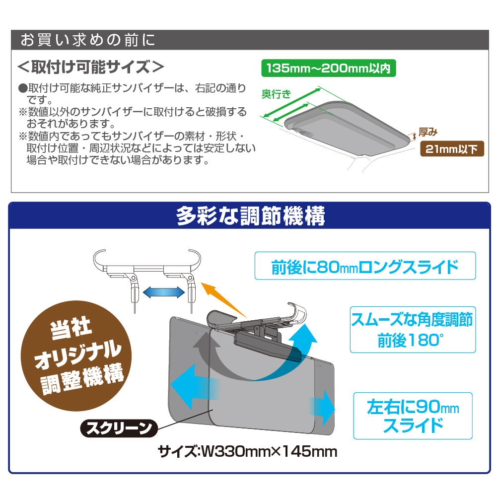 | ・純正バイザーの奥行き135 ~ 200mm 以内・厚み21mm以内まで取付け可能です。 ※スクリーンサイズ 330mm×145mm ・純正サンバイザーに簡単に取付けできます。 ・前後に80mm・左右に90mmのスライドが可能です。 ※純正サンバイザーを調整することでさらに広範囲に使用できます。 ・UVカット素材で有害な紫外線から目を保護します。 ・本製品を取付けたまま純正バイザーミラーが使用できます。 ・スクリーンは、任意の角度で保持できるトルクヒンジ仕様です。 |