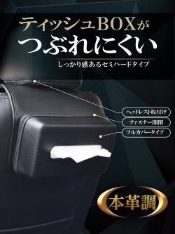 | ・ヘッドレストに取付けるセミハードタイプのティッシュケースです。 ・車内に馴染む厚手の高品質シンセティックレザーを使用しています。 ・しっかり感があるセミハードタイプなので、ソフトパック・ボックスがつぶれにくく、ティッシュを取出す際に破れにくいです。 ・ソフトパックティッシュや厚みが65mmまでのボックスティッシュまで幅広く対応します。 ・取付け用リングをヘッドレストのシャフトに通すだけで簡単取付けです。 ・ファスナー開閉タイプなのでヘッドレストに取付けたままティッシュを交換できます。 Amazonでご購入はこちら |