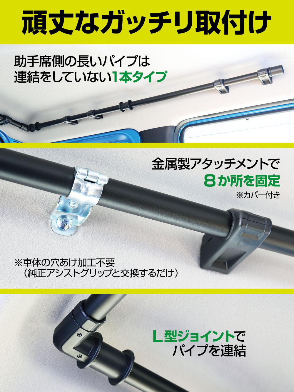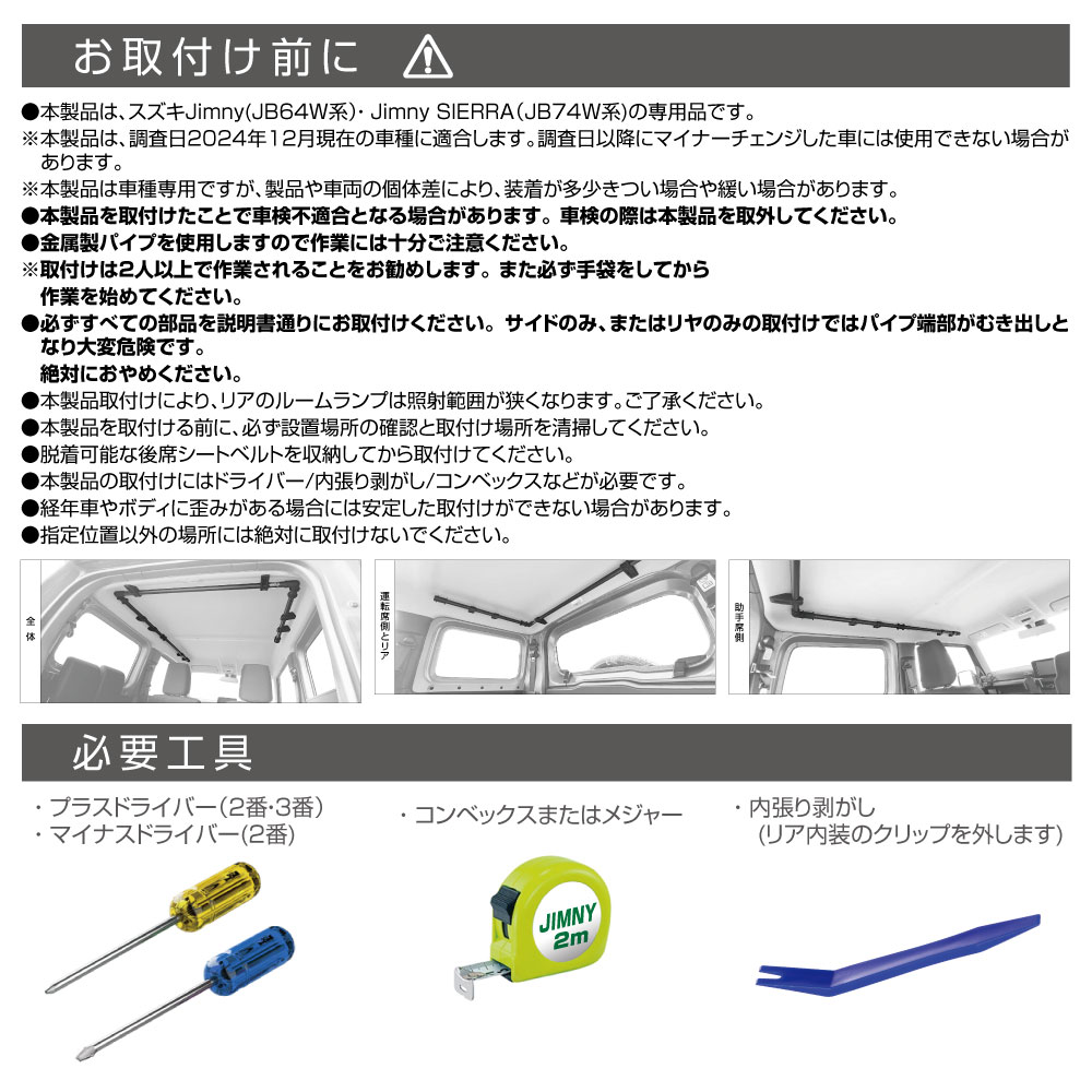 | ・ラゲッジスペースの天井空間を有効活用し、収納力をアップするコの字型の増設サイドバー ・人気のジムニー専用品EE-231 サイドバーのロング&連結Ver. ・助手席側のバーはEE-231よりも約60cmも長く、さらにラゲッジ入口側のサイドを連結することで頑丈さと収納力を向上。 ・傷に強く、ザラついた見た目が特長の粉体塗装仕上げのブラックバーが、室内を無骨に演出 ・アシストグリップのネジ穴を利用し、加工無しで取付けが可能 ・ルーフネットやハンガーなどがズレ落ちない専用エンドキャップを採用 ●掲載の製品は、スズキ Jimny(JB64W系)・Jimny SIERRA(JB74W系)専用です。 ※Jimny NOMADE(JC74W系)には、取付けできません。 一部の車種には、取付けできない場合があります。詳しくは、下記の適合表をご確認ください。 <適合表のリンク> ※本製品は、調査日2025年8月現在の車種に適合します。 調査日以降にマイナーチェンジした車には使用できない場合があります。 ●掲載の製品の適合型式 : Jimny(JB64W系) 【1型~4型】、 Jimny SIERRA(JB74W系)【 1型~4型】、Jimny NOMADE(JC74W系)【 1型 】 ※詳しくは、下記の型式表をご確認ください。 <型式表のリンク> ※本製品は、調査日2025年7月現在の車種に適合します。 調査日以降にマイナーチェンジした車には使用できない場合があります。 |