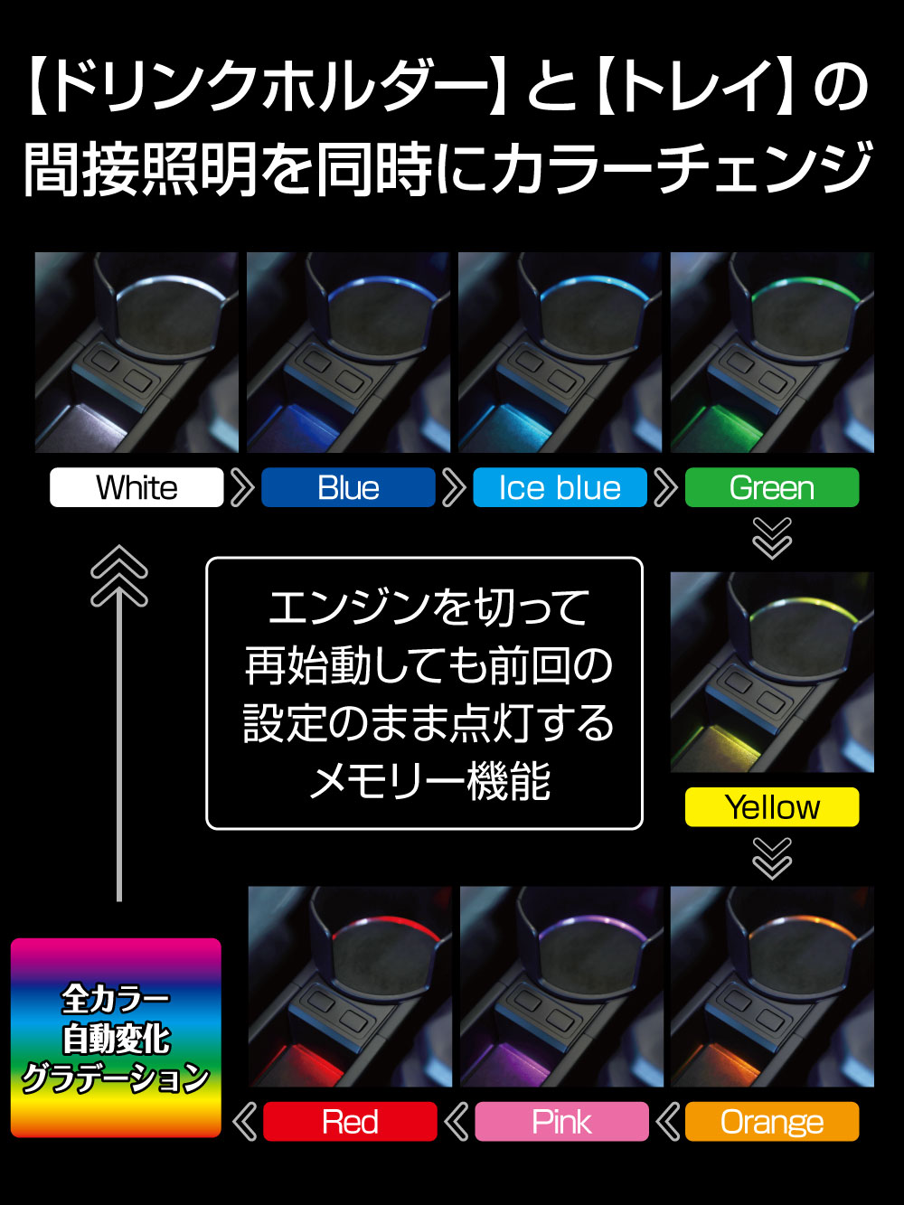 | ・センターコンソールのデッドスペースを収納スペースに有効活用できる増設トレイです。 ・φ72mmまでの飲み物が入るドリンクホルダー、小物を置けるトレイ、スマホなどを充電できるUSBポートを備えています。 ・ドリンクホルダーとトレイの内底に間接照明を装備しているので、暗い車内でもドリンクや小物の出し入れに便利です。 ・間接照明は、8色の単色固定点灯・グラデーション点灯・ホタルモードを選べ、明るさの調整ができます。 ・間接照明は、エンジンを切って再始動しても前回の設定のまま点灯するメモリー機能を搭載しています。 ・USB-A&USB-Cの2ポート搭載で様々な機器に対応できます。 ・USB-AはQC※1、USB-CはPD※2に対応で高速充電が可能です。 ※各ポート単独使用時にQCとPDの各対応機器で最大30Wの高速充電ができます。両ポート同時使用時は合計で 5V/3.5Aになります。 ・収納部の内底はカタカタ音を低減するクッションシート付きです。 ・AT車/MT車のどちらでも簡単に取付けられます。 ※工具不要 ●掲載の製品は、スズキ Jimny(JB64W系)・Jimny SIERRA(JB74W系)・Jimny NOMADE(JC74W系)専用です。 ※一部の車種には、取付けできない場合があります。詳しくは、下記の適合表をご確認ください。 <適合表のリンク> ※本製品は、調査日2025年8月現在の車種に適合します。 調査日以降にマイナーチェンジした車には使用できない場合があります。 ●掲載の製品の適合型式 : Jimny(JB64W系) 【1型~4型】、 Jimny SIERRA(JB74W系)【 1型~4型】、Jimny NOMADE(JC74W系)【 1型 】 ※詳しくは、下記の型式表をご確認ください。 <型式表のリンク> ※本製品は、調査日2025年7月現在の車種に適合します。 調査日以降にマイナーチェンジした車には使用できない場合があります。 |