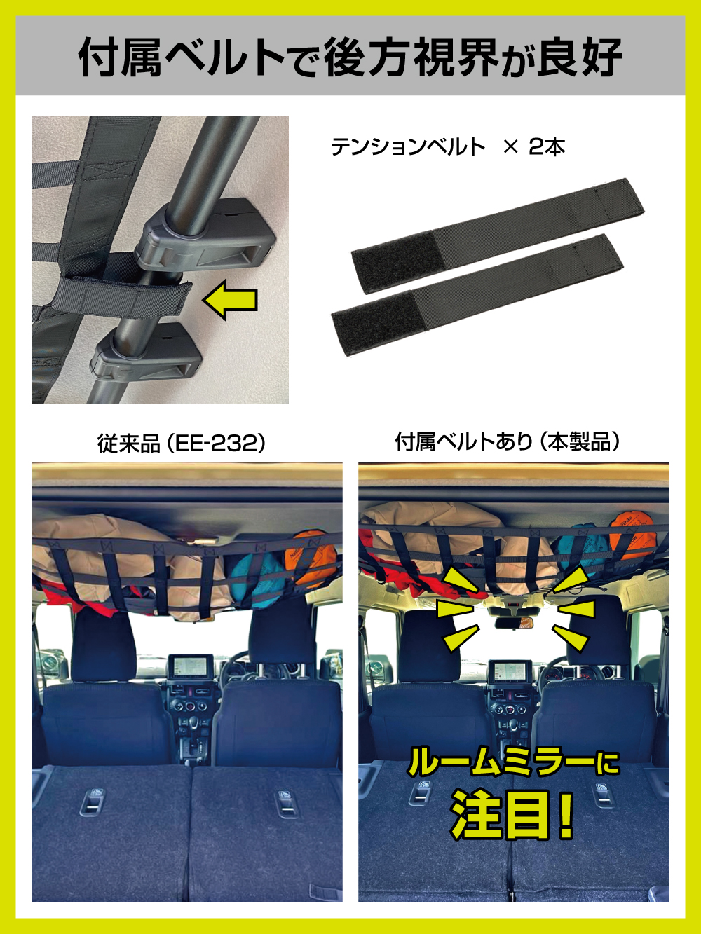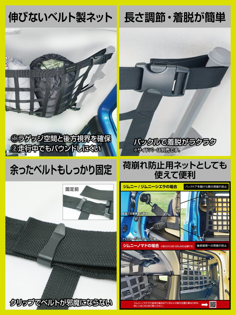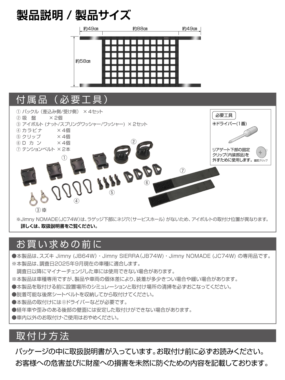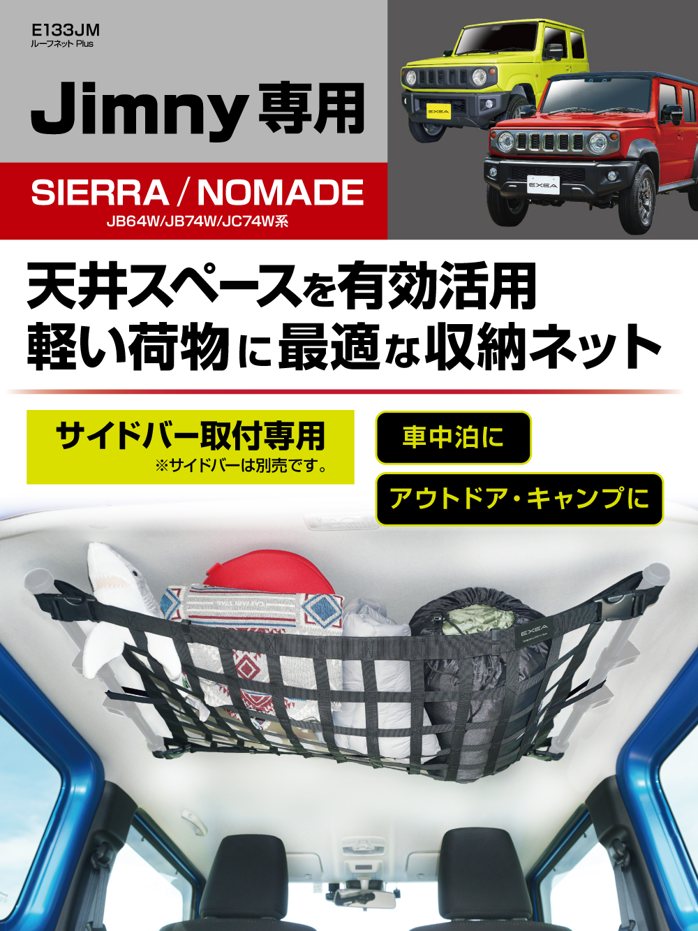 | ・車内の荷物の収納や荷崩れ防止に最適なネットです。 ・しっかりとしたベルト素材のネットなので荷物の重さで伸びにくいです。 ・付属の様々なアタッチメントを使用すると、荷崩れや横滑りを防止するカーゴネットとして取付け可能です。 ・ネットもステッチも黒色だから、ブラックアウトされた無骨なラゲッジ空間を演出します。 ・テンションベルト/アイボルト/カラビナ/Dカンが付属して、組み合わせ次第で様々な取付けができます。 ・テンションベルトと別売のサイドバーを併用するとルーフネットをピンと張れて、後方視界がより良好になります。 < 別売のサイドバーにお取付けいただく場合 > ・ラゲッジの天井デッドスペースを有効活用し、軽い荷物の収納に最適です。 ・収納が簡単に増設できるので、車中泊やアウトドア・キャンプに重宝します。 ・垂れ下がりにくいので、車中泊時には車内の圧迫感を軽減します。また、走行中の後方視界も塞ぎにくいので安心です。 ・荷室に積んだ荷物と分けられるので、使用頻度の高い上着や帽子などの出し入れがスムーズになり便利です。 ・伸びにくいベルト製ネットは走行中でもバウンドしにくいので安心です。 ・別売のサイドバー(EE-231やE114JM、E128JM)に取り付ければ、収納力がさらにアップし、車中泊がもっと快適になります。 ●掲載の製品は、スズキ Jimny(JB64W系)・Jimny SIERRA(JB74W系)・Jimny NOMADE(JC74W系)専用です。 詳しくは、下記の適合表をご確認ください。 <車種別適合表のリンク> ●掲載の製品の適合型式 については、下記の型式表をご確認ください。 <型式表のリンク> |