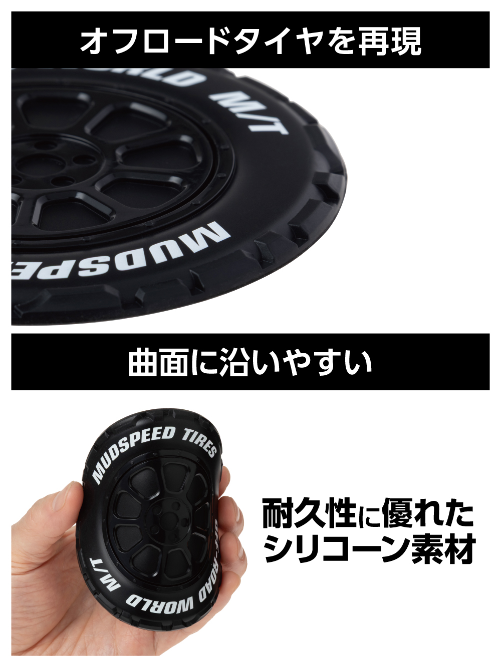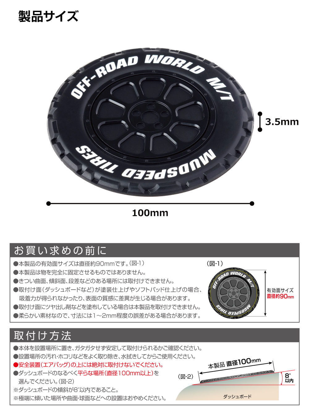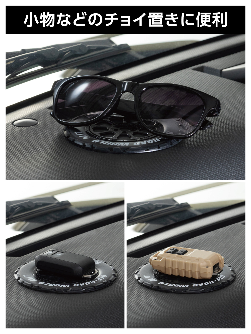 | ・オフロード用タイヤを再現した立体的なすべり止めマットで、スマホ・駐車券・硬貨などの小物置きに便利です。 ・ダッシュボードに置くだけの簡単取付けで、小物などのすべりを防止します。 ・耐候性に優れ、ダッシュボードの緩やかな曲面に沿いやすいシリコーン素材を採用しています。 ・粘着剤などを使用していないため、ベタ付きや糊残りの心配がありません。 ・ゴミやホコリですべり止め効果が弱まった場合は、水洗いすれば繰り返し使えます。 |