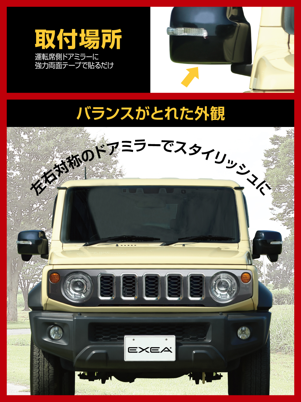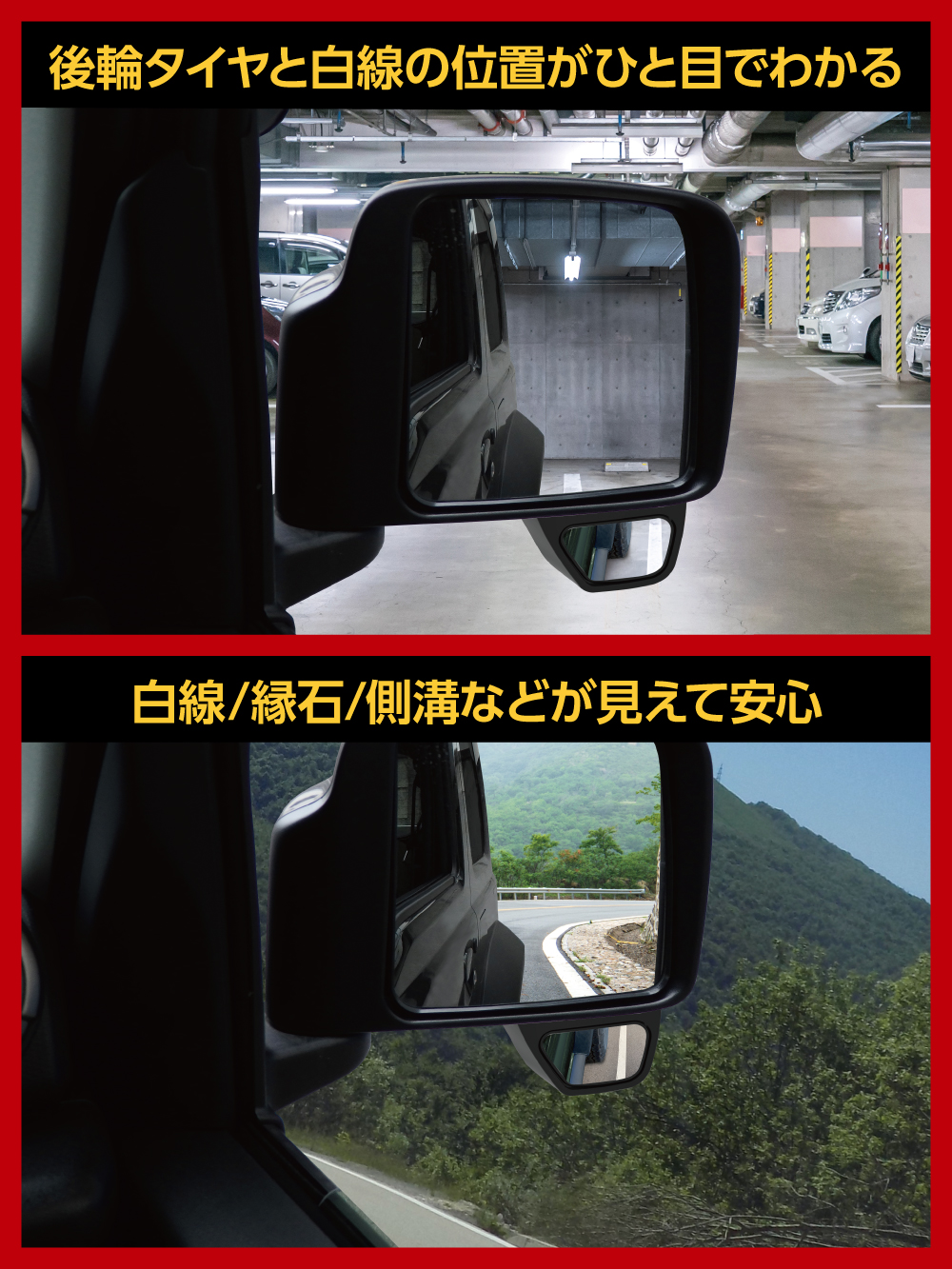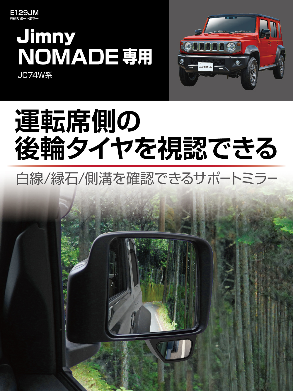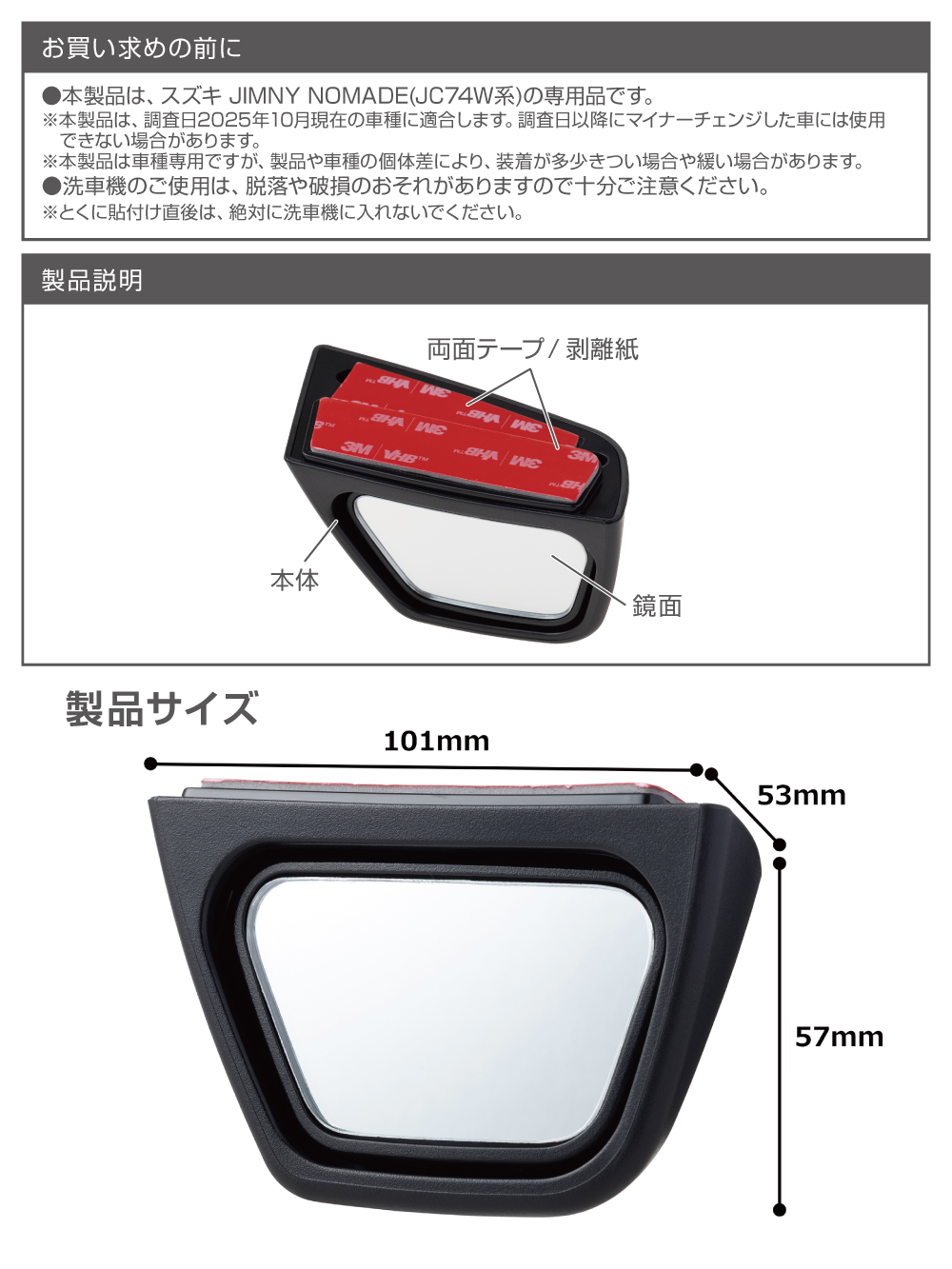 | ・Jimny NOMADE(JC74W系)専用の、運転席側ドアミラーに取付けるサポートミラーです。 ・運転席側の後輪タイヤと白線/縁石/側溝などの位置を視認できます 。 ・見やすい広角R300曲面鏡を採用し、鏡面可動で取付け後も微調整ができます。 ・左右ドアミラーのバランスがとれて、外観がよりスタイリッシュになります。 ●掲載の製品は、スズキ Jimny NOMADE(JC74W系)専用です。 ※ Jimny(JB64W系)・Jimny SIERRA(JB74W系)には、取付けできません。詳しくは、下記の適合表をご確認ください。 <車種別適合表のリンク> ●掲載の製品の適合型式 については、下記の型式表をご確認ください。 <型式表のリンク> |