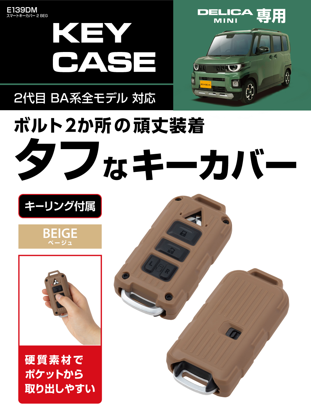 | 【5月中旬発売予定】 ・2代目デリカミニ(BA系全モデル、2025年10月~)専用の純正スマートキーを保護するキーカバーです。 【ベージュ】 ・2か所の六角穴ボルトでしっかり装着でき、傷や衝撃から純正スマートキーを守ります。 ・衝撃吸収構造の採用により、落下時の衝撃を緩和します。 ・両面テープを使わないのでテープ跡が残りません。 ・カバーを付けたまま、ボタン操作やメカニカルキーの着脱ができ、純正キーの作動表示灯も確認できます。 ・付属の3ボタン型専用のボタンパッドに交換できます。 ・キーホールにキーホルダーやストラップが取付けられます。 ・六角穴ボルト、六角レンチ、キーリング、を付属しています。 ・2トーン仕様にアレンジ可能。 ※2トーン仕様にするには、異なる色を2色ご購入ください。 ・3代目 eKスペース(BA系全モデル、2025年10月~)にも装着可能 |