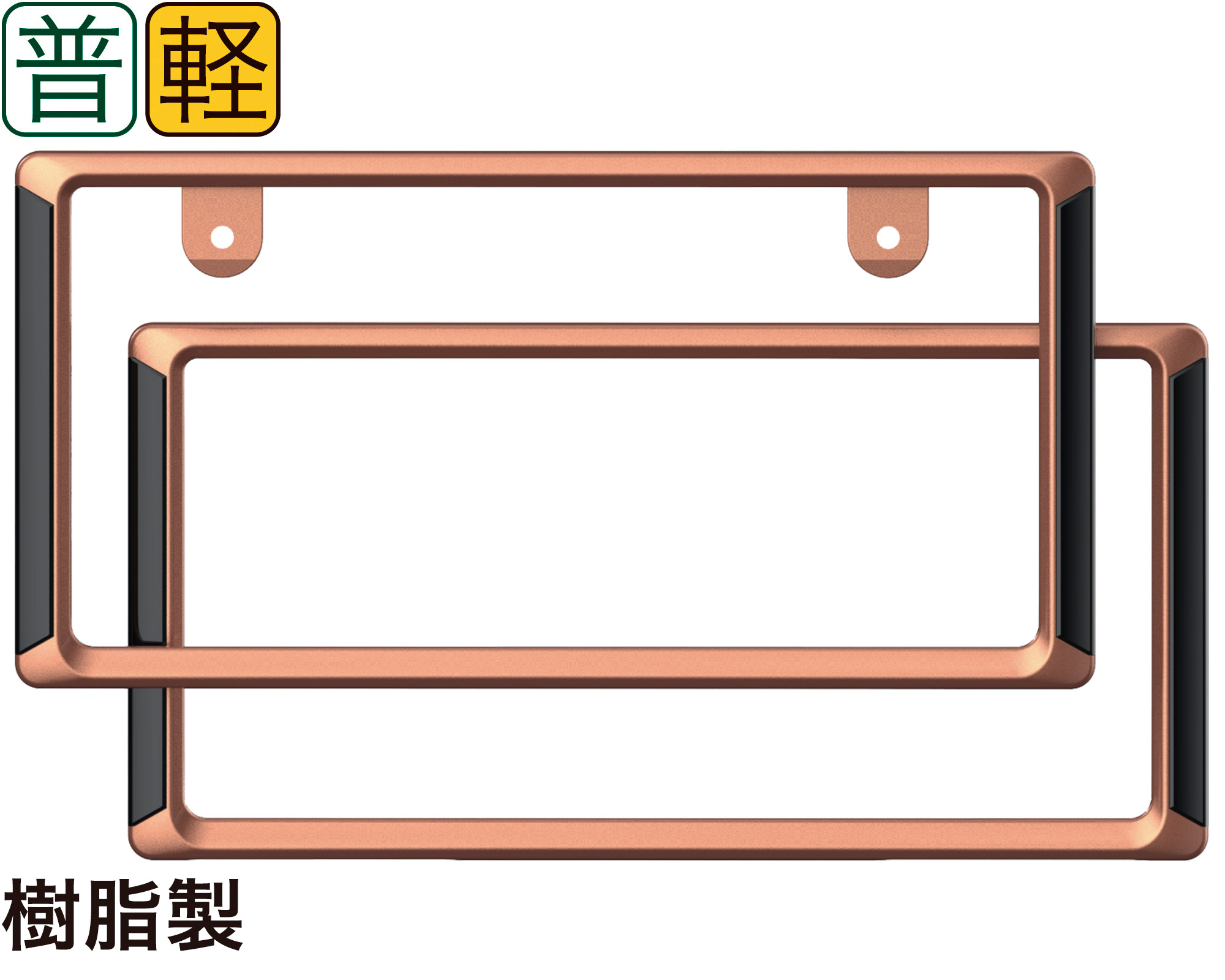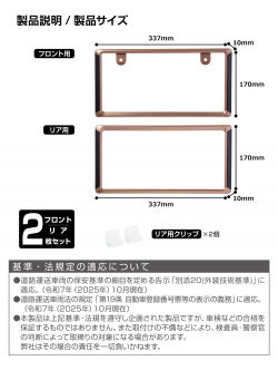 | ・カッパーと艶黒パネルを組合わせ、落ち着いた高級感あるナンバーフレームです。 ・カッパー&クリアの2層塗装仕上げです。 ・普通車・軽自動車兼用の前後セット。 ・ナンバーフレームの基準・法規定に適合した製品です。 |