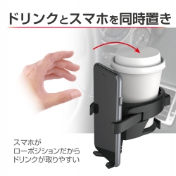 | ●ドリンクとスマホを同時置きできるドリンクホルダーです。 ●コンビニコーヒー、細缶・太缶、太ペットボトル(500ml/550ml)を収納できます。 ●スマホホルダーが低めの位置にあるのでドリンクの出し入れが容易です。 ●スマホホルダーはワンタッチで簡単に引き出せて、使わない時はすっきりと格納できます。 ●ソフトパッド付きカーボン調アームがスマホをしっかりとホールドします。 ●3点でソフトにサポートするシリコンフラップがドリンクを安定させ、振動音も抑えます。 |