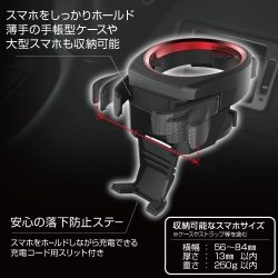 | ●ドリンクとスマホを同時置きできるドリンクホルダーです。 ●コンビニコーヒー、細缶・太缶、太ペットボトル(500ml/550ml)を収納できます。 ●スマホホルダーが低めの位置にあるのでドリンクの出し入れが容易です。 ●スマホホルダーはワンタッチで簡単に引き出せて、使わない時はすっきりと格納できます。 ●ソフトパッド付きカーボン調アームがスマホをしっかりとホールドします。 ●3点でソフトにサポートするシリコンフラップがドリンクを安定させ、振動音も抑えます。 |
