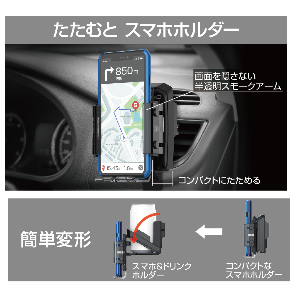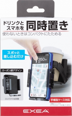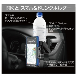 | ●ドリンクとスマホを同時置きできるドリンクホルダーです。 ●たたむとコンパクトなスマホホルダーに、開くとスマホも同時に置ける ドリンクホルダーになります。 ●コンビニコーヒー、細缶・太缶、600mlペットボトルを収納できます。 ●大きな手帳型ケースからスリムケースまで幅広く収納可能です。 ●ピアノブラック&カーボン調ボディのスポーティデザインです。 |
