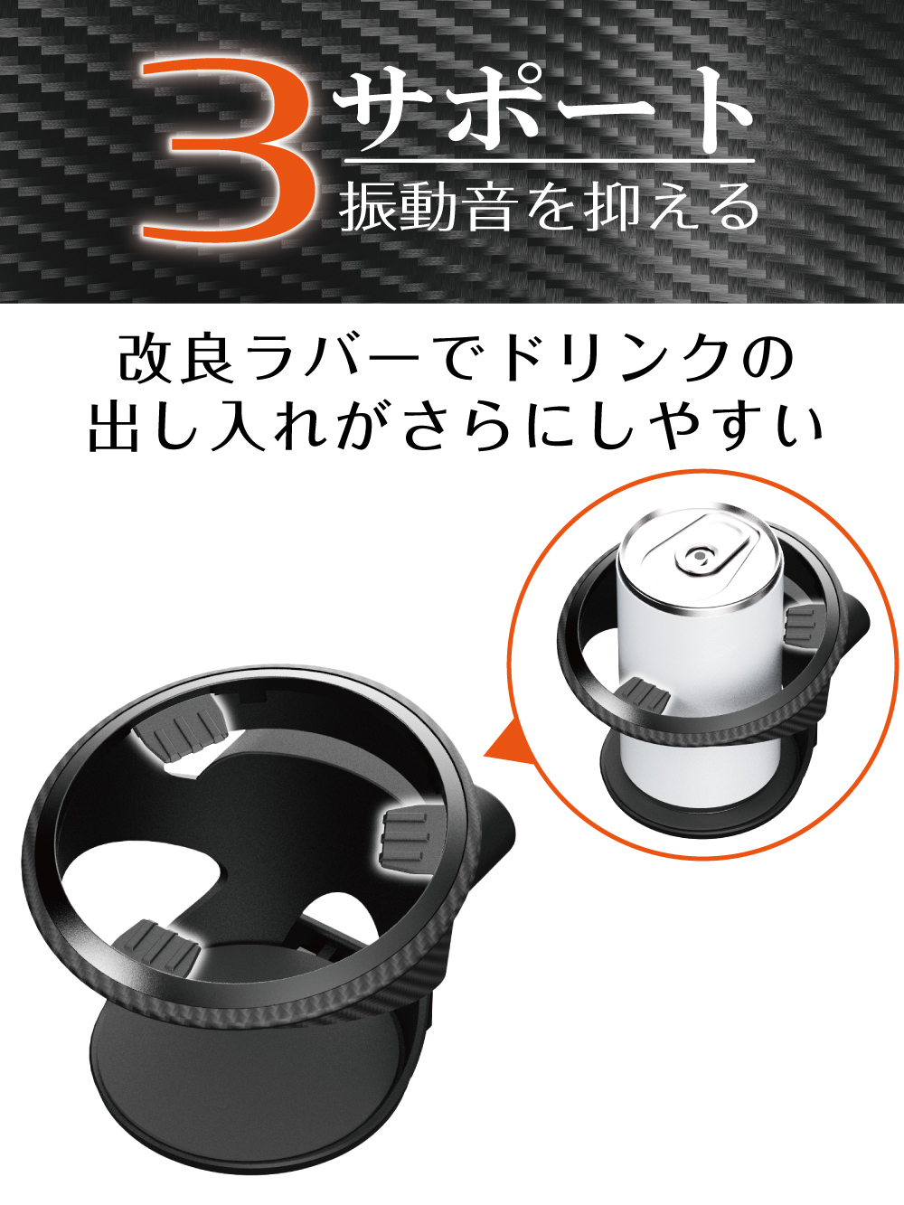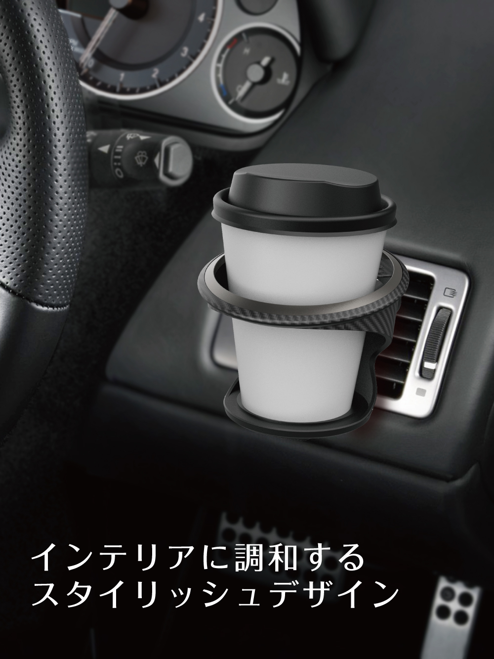 | ・シンプルでスタイリッシュなエアコン取付けのドリンクホルダーです。 ・スポーティなカーボン調で、室内空間に上質な雰囲気を演出します。 ・3点でソフトにサポートするラバーが安定感を高め振動音も抑えます。 ・コンビニコーヒー、太缶、細缶、600ml ペットボトル(直径53~73mm)までホールドします。 Amazonでご購入はこちら |
