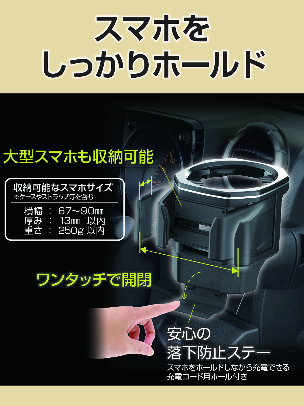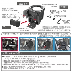 | オープンプライス ■製品サイズ : H 103 xW 96 xD 107 ■パッケージ : H 180 xW 130 xD 110 285 g ■小箱サイズ : H 200 xW 570 xD 540 20個入 ■外箱サイズ : H 420 xW 590 xD 560 40個入 ■スマートフォン収納サイズ: 幅67~90mm 厚さ13mm 重さ250gまで ■ジムニー/ジムニーシエラ(JB64W/JB74W系)専用設計 ■JAN: 4974267301117 |