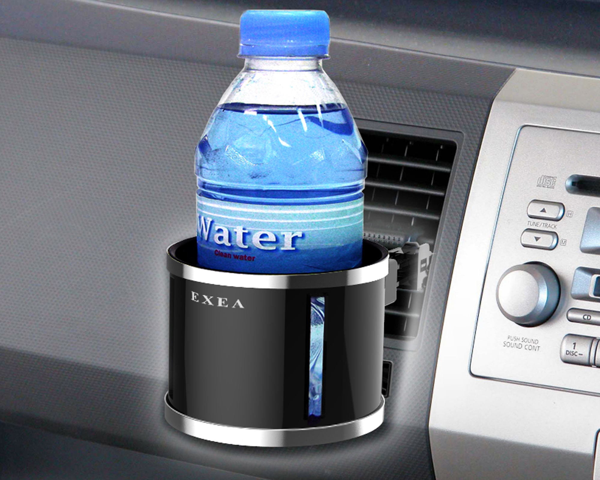| エアコンルーバー取付けの保温・保冷のできるドリンクホルダー シンプルなフォルムとメタリックリングが高級感を演出 3種類の樹脂クリップで幅広い取付けに対応 |