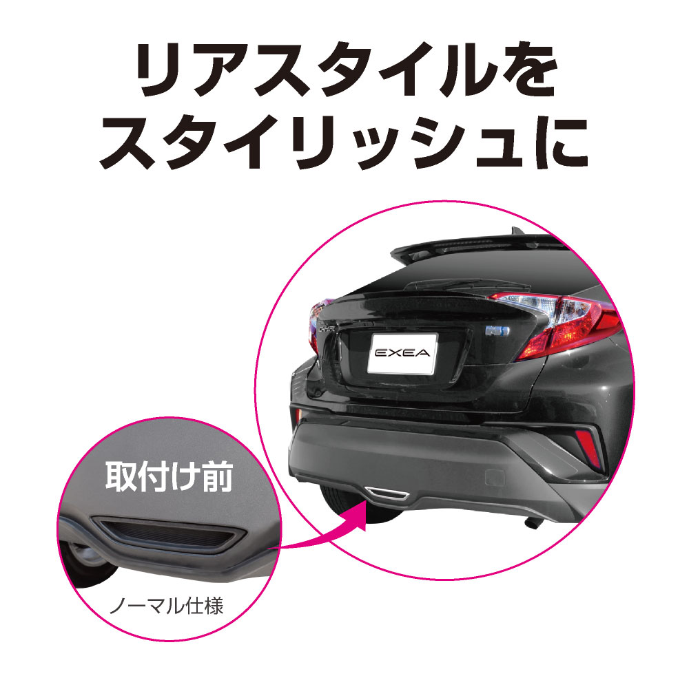 | ●貼付けるだけで、センターマフラー風にドレスアップできるリングです。 ●シンプルなノーマル仕様のリアスタイルをスポーティーに変身。 ●高級感あるクロームメッキ仕上げが、引き締まった印象を与えます。 ●両面テープが外から見えないので、エクステリアの雰囲気を壊しません。 ●別売のC-HR専用リアフォグパネル(EE-209)と併用できます。 ●対応車種: トヨタ CH-R ZYX10/NGX10/NGX50系 前期2016 年12 月以降 2019 年10 月18 日より前の車種 ※トヨタ純正リアフォグランプ搭載車(寒冷地仕様)には取付けができません ※後期2019 年10 月18 日以降の車種には取付けができません |