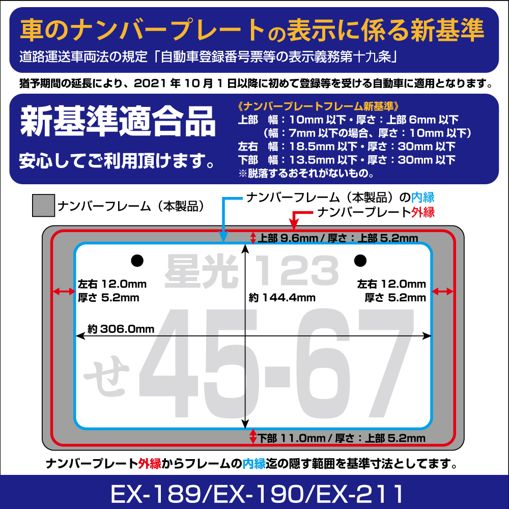 | ●ブラッククロームメッキにカーボン調パネルを組合わせた、ラグジュアリーなナンバーフレームです。 ●高級ブラッククロームメッキ仕上げが上質感とプレミアム感を演出し、ドレスアップに最適です。(樹脂製) ●普通車と軽自動車のナンバープレートにご使用できます。(前後2枚セット) ●ナンバープレートの表示に関する新基準に適合します。 ●2022年(令和4年)2月1日現在の基準・法規定に適応した製品です。 ・道路運送車両法の規定「第19条自動車登録番号票等の表示義務」に適応(令和4年2月現在) ・道路運送車両の保安基準の細目を定める告示「別添20(外装技術基準)」に関し、第1節の新車登録前の車両のみに適応される基準であるため、第3節の継続車検時の車両については適応されない基準であることが2016年10月7日付けで発表されました。したがってアフターパーツである当商品は適応の必要がないとされております。 ●本製品は上記基準・法規を遵守し企画された製品ですが、車検等の合格を保証するものではありません。また、取付けの不備等により、検査員・警察官の判断によって取締りの対象になる場合があります。当社はその場合の責任を一切負いかねます。 |