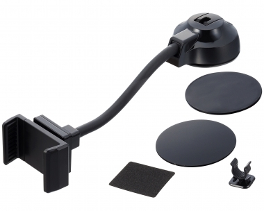 | 自由な方向へ曲げることの出来るフレキシブルアームを採用 画面が隠れないスライドアーム&360度回転ジョイント 取付自在な吸盤タイプ(凹凸面用のゲルと補助板が付属) |