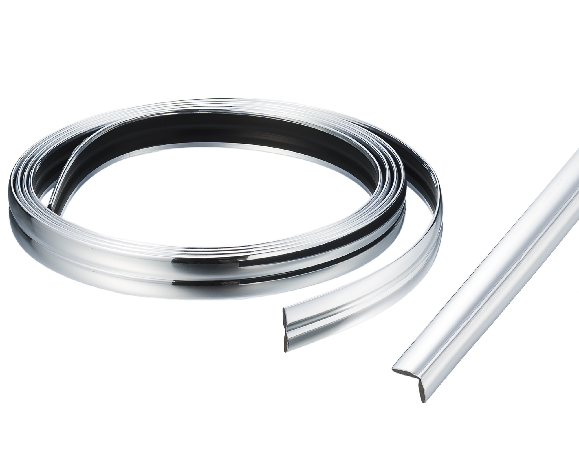 | 断面がL型にも曲がりメッキが際立つドレスアップ用モール ラジエターインテークフィンやドアポケットをさりげなく演出 フラットで16mm / 曲げて9mm (全長2mの1本巻) |