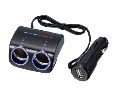 | 12Vの2連ソケットと5V1.2AのUSBポートに分配したソケット USBでiPodや携帯電話に電源を供給・充電することが可能 ソケットの向きを自在に360°回転できるソケット |