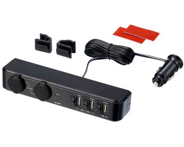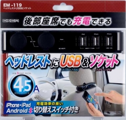 | ヘッドレストに装着できるUSB&ソケット 12Vソケットと5V3.0A(2ポート合計)+1.5A(1ポート) Apple製品とその他USB製品の充電切り替えスイッチ付き |