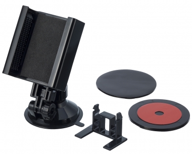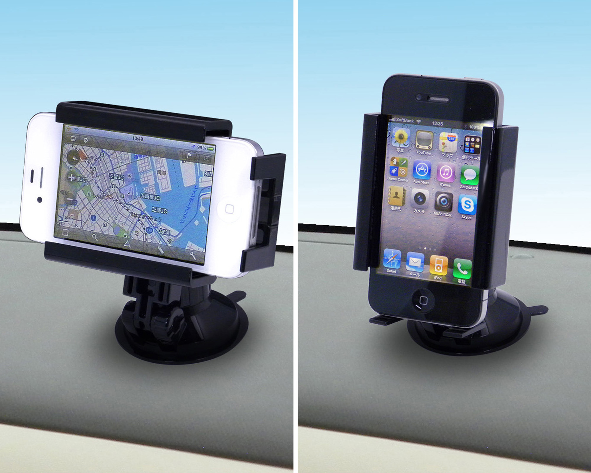 | スマートフォン等を上からスポっと入れるだけの簡単ホルダー 取付自在な吸盤を採用(凹凸面用のゲルと補助板が付属) 3D可動で正面左右が360度・前後に180度調整可能 |