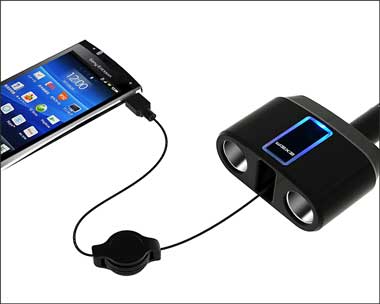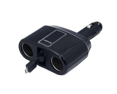 | 12Vの2連ソケットと5VのmicroUSBに分配したソケット リールコード式microUSBでスマートフォンを充電可能 首振り+回転で向きが自在なダイレクトタイプ |