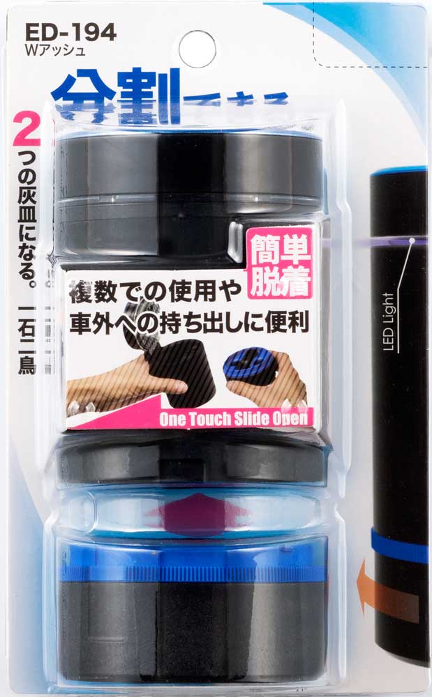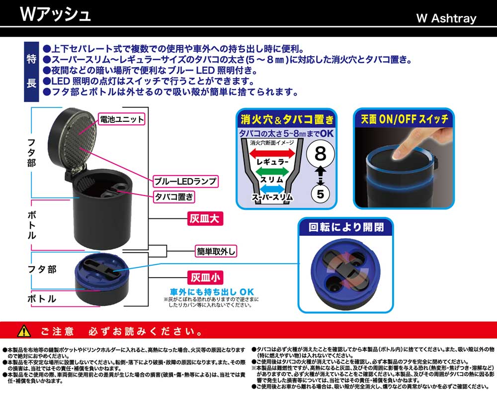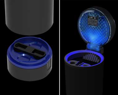 夜間などの暗い場所で便利なブルーLED照明付き灰皿
